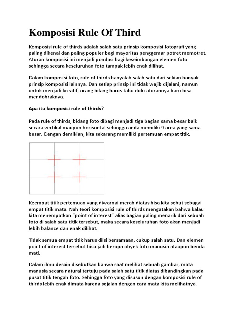Source: imgv2-2-f.scribdassets.com Komposisi rules of third agar foto lebih enak dimata. What are the points of interest in this shot? Pemilihan garis atas atau bawah umumnya ditentukan mana yang lebih menarik, langit atau daratannya. Sesuatu yang berjumlah ganjil biasanya akan tampak lebih menarik dan dinamis. Rule of third merupakan teknik komposisi paling dasar yang sudah umum diketahui fotografer. Intinya rule of thirds adalah garis bantu atau guidelines yang membagi gambar menjadi sembilan bagian yang sama besar dengan menarik dua 19. Dalam rule of third, fotografer cukup membagi bidang foto menjadi 9 kotak yang sama besar dan meletakkan poi (point of interest) pada titik atau garis pada bidang yang terbagi menjadi 3. Rule of thirds merupakan salah satu teknik foto terkenal dalam bidang fotografi. Dalam menentukan komposisi pada sebuah foto, seorang fotografer tentu punya aturan main berdasarkan pengalamannya.